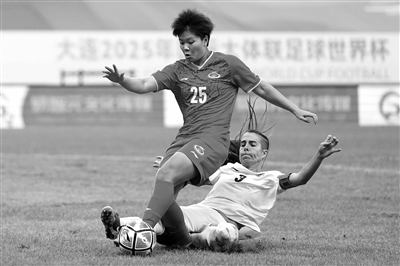 9月17日,2025年国际大体联足球世界杯揭幕战在大连梭鱼湾足球场举行,上海体育大学女队4比0战胜西班牙瓦伦西亚大学女队。图为上海体育大学女队球员尹丽红(左)在比赛中突破。