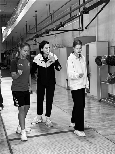 倪红的课堂上出现了几张外国面孔,面对留学生,尽管语言不通,但倪红创新运用了 “肢体教学”法。在步伐训练环节,一位留学生的动作出现了问题,倪红看到后焦急地摇了摇头,随后上前弯下腰,拍了拍她的后腿,从倪红的神情以及动作中,女孩知道了问题出在腿部。紧接着,倪红示范规范动作,并在留学生面前强调动作上的易错点……整个过程虽然没有语言上的交流,但起到了不错的教学效果。“我是第一次接触击剑,如果再给我一次机会,我依然愿意选择这位老师,尝试这项运动。”留学生玛丽亚说。