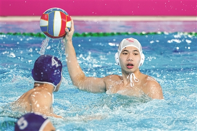 10月22日,在广州举行的第十五届全国运动会男子水球小组赛A组第二场比赛中,重庆队35比11战胜浙江队。图为重庆队球员覃杨(右)在比赛中传球。 新华社记者 陈思汗摄