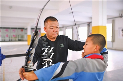新疆伊犁察布查尔锡伯自治县被誉为“中国箭乡”,“传统箭术(锡伯族射箭)”被列入国家级非物质文化遗产代表性项目名录,吴俊亮是这项非遗的自治区级传承人。图为在新疆伊宁市第二十五小学,吴俊亮指导射箭社团学生练习现代反曲弓。 新华社记者 胡虎虎摄