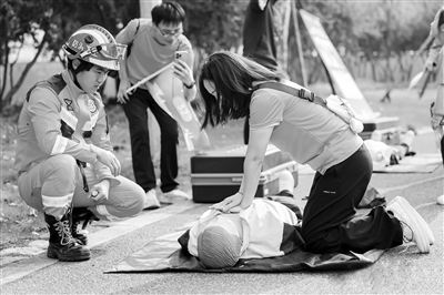 活动中,参赛选手统一身着“火焰蓝”赛服,沿着4公里世博滨江黄金岸线开跑,沿途设置9个任务点,项目设计兼顾运动量与实用性,如“水枪神射手”环节考验选手在快速移动后的精准操作能力;“迷雾突围”模拟真实火场环境,让参与者在烟雾中练习低姿前进的体能和技巧;“心跳救援”则融合心肺复苏按压训练,强化参与者在运动状态下的应急反应能力,这些项目提升了群众在突发情况下的自救互救能力。