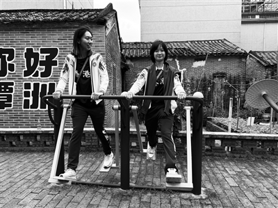 全运会期间,在广东佛山参观的香港女篮队员体验社区里的全民健身路径。本报记者 王世让摄