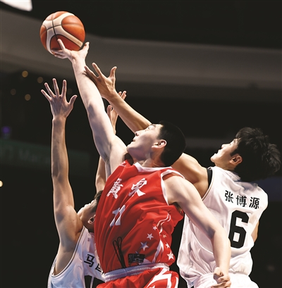 11月18日,十五运会篮球男子18岁以下组金牌赛中,广东队85比78战胜山东队,获得冠军。图为广东队冯熙瑞进攻上篮。本报记者 王宪民摄