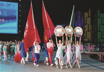 在欢快热烈的气氛中,各参赛代表团代表入场。全体起立,高唱中华人民共和国国歌。
