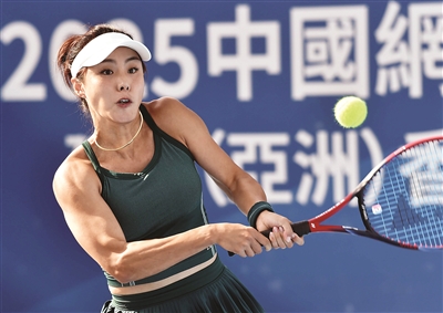 11月26日,在2025中国网球巡回赛香港公开赛女子单打第一轮比赛中,个人选手王蔷2比0战胜河南选手赵溪晨,晋级下一轮。图为王蔷在比赛中回球。 新华社发 (卢炳辉摄)