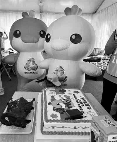没多久,工作人员便笑着走来说:“专门给记者朋友庆祝节日,准备了烧鹅和蛋糕,一定要来尝尝呀!”紧接着,志愿者又送上两份极具东莞特色的礼物——烧鹅形状的玩偶和钥匙扣。要知道,在东莞,除了篮球,最出名的便是烧鹅了。工作人员、媒体记者和志愿者纷纷拍照合影,围在一起分享蛋糕,陌生的距离感在欢声笑语中瞬间消融。
