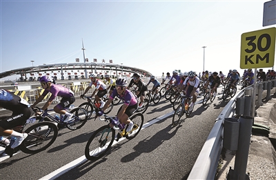 第十五届全国运动会公路自行车男子个人赛,参赛选手经过港珠澳大桥闸口。 新华社记者 邓华摄