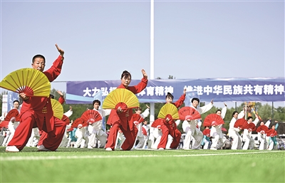 群众参加百人功夫扇展演。 新华社记者 王鹏摄