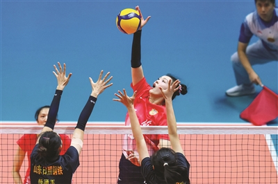 张常宁(上)在比赛中扣球。新华社发(张金加摄)