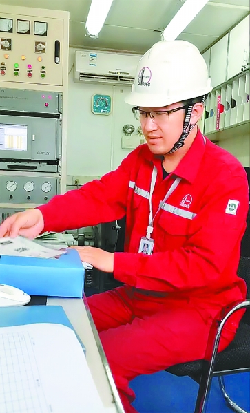 李信智在录井仪器房里整理安全资料。张井伟 摄