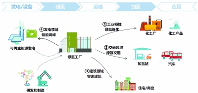 随着经济发展和技术革新,绿氢的应用场景逐渐从工业领域向交通、发电、建筑等部门拓展,绿氢产业的内涵因而不断扩充,以电解水制氢为核心,向上游与可再生能源发电、设备制造等行业密切相关,向下游延伸出氢气储存、运输、加注等工艺环节。