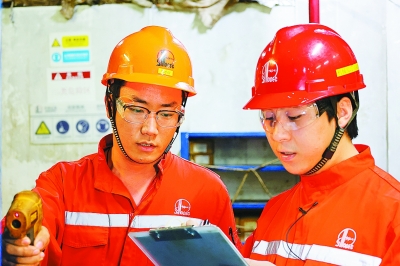 勘探四号机械组的商富康踏出舱门,开始了夜间巡检。1999年出生的商富康是平台最年轻的员工,他所在的小组需要确保平台上所有设备随时处于优良状态,大到防喷器、顶驱,小到抽水马桶、水龙头。换句话说,他们就是平台设备的“主治医师”。