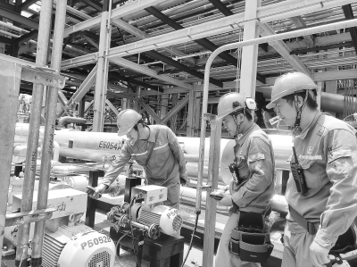 近日,海南炼化3号聚丙烯装置成功开发抗冲共聚新产品HN7116,并产出400吨合格粒料。这是该公司今年开发的第13个新牌号产品,该产品具有中熔融指数、中高抗冲性能的特点,主要应用于家电、汽车零配件等,可进一步丰富该公司聚烯烃产品结构、增强市场竞争力。图为员工巡检聚丙烯装置。高 一 摄 邱元广 文