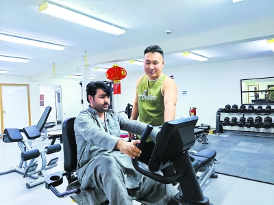 图为沙特泵站项目部中外员工业余时间在健身房锻炼交流。张意锐 摄