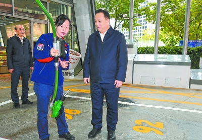 11月4日,侯启军在上海石油第一加油站现场调研。 本报记者 程 阳 摄
