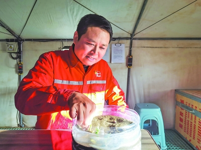 帐篷里种的大蒜发了绿芽,这给沙漠中的物探队员带来些许生活乐趣。
