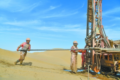 在沙漠中钻井,物探队员浑身沾满泥水。