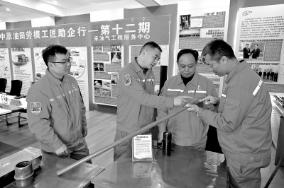 连日来,中原油田采油气工程服务中心开展以“工匠解难题 创新促发展”为主题的劳模工匠助企行主题活动。在基层单位活动现场,劳模工匠们依次介绍自主创新制作或改造的工具,重点阐述工具的创新点、应用场景及使用效益,并与一线员工探讨现场技术难题。图为活动现场,集团公司技能大师、感动石化人物杨相杰(左二)与大家研讨漏液接球装置改良方案。赵奕松 摄 孙 博 文