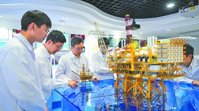 科研人员在导管架平台模型前探讨技术方案。