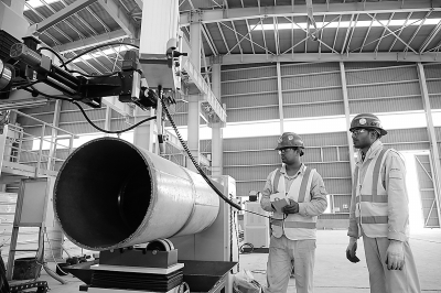 今年以来,南京工程公司持续提升全产业链一体化效能,围绕工程模式创新、供应链优化与成本管控等重点任务,推动海外工程项目设计提质、执行提速、集采增效。该公司积极推动中东制造基地实体化运营,通过实施“工厂预制+现场装配”并行建造模式,提升工程标准化水平与整体执行效率。图为外籍员工在中东制造基地开展管道自动焊接工作。