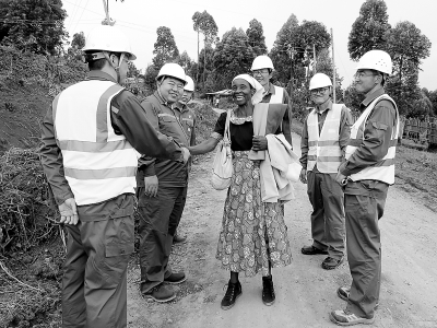 肯尼亚村民卡利姆(左四)向胜利建工公司项目部成员表达感谢。