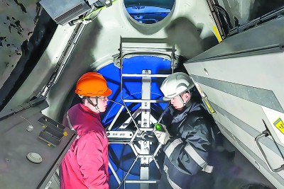 江苏油田油服中心电力运维公司员工检修风电设备。程明明 摄