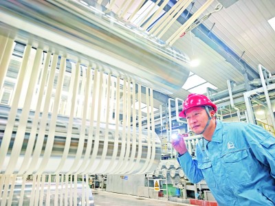今年以来,仪征化纤高附加值产品再生涤纶短纤产量保持增长态势,1月订货量同比增长40%,是该公司循环再利用领域首个年产量超万吨的拳头产品。图为2月3日生产装置加紧排产满足用户需求。本报记者 刘玉福 摄