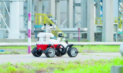 青岛炼化智能巡检机器人在储运罐区现场巡检。