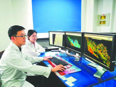 ▲胜利油田物探研究院技术人员正在基于“数字油藏”技术开展研究。张 磊 摄