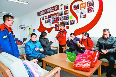 2月19日正月初三,广西梧州石油都连加能站强化节日服务,邀请顾客一起吃汤圆,向他们介绍周边景点。图为自驾出游的顾客在站内休息、吃汤圆。黎 菲 摄