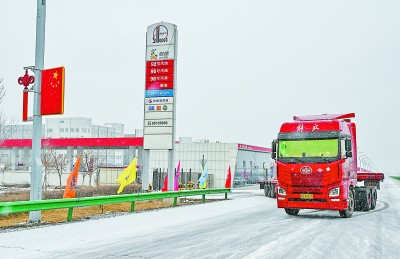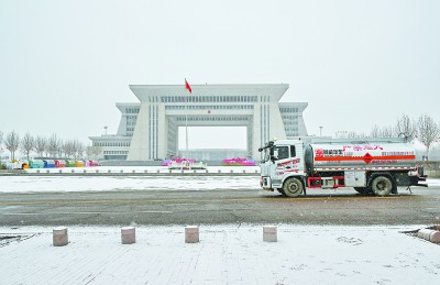 霍尔果斯一号加能站位于中哈边境霍尔果斯口岸,距“国门”仅80米。2月28日,大雪纷飞,该站组织油罐车前往物流园区为贸易车辆现场加油。