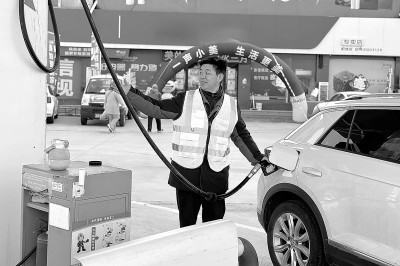 3月9日正值油品调价窗口期,加能站车流量激增。山东滨州石油迅速组织26名市、县两级管理人员下沉一线,到汽油大站及省国道、高速路口等重点站点开展帮扶。他们通过协助引导车辆、维护现场秩序、优化站容站貌及推介易捷商品等举措,有效提升了车辆通过率与客户满意度。图为滨州石油管理人员在阳信2站为客户的车辆加油。杨希芹 摄