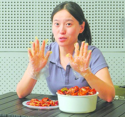 金陵石化员工张霄敏讲解为什么吃小龙虾手套不防油。