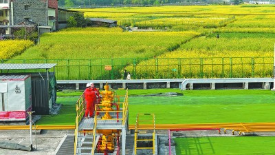 图2:华东油气分公司南川页岩气田坚持安全为先、生产为要,全力加快上产节奏,目前气田日产气量稳定在568万立方米以上。图为3月13日员工在DP2平台巡检。