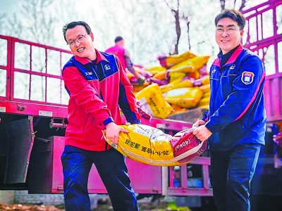 3月以来,山西临汾石油针对农户春耕需求,组建青年突击队开展“送农资入户”活动,将一袋袋化肥送到农户手中,打通惠农助产“最后一公里”。图为近日青年突击队队员为农户送化肥。董 磊 摄 秦晓耕 文