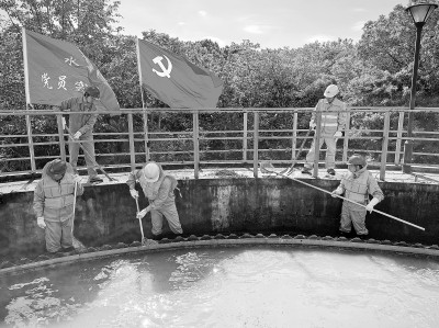 近日,扬子石化水务部供水工区党支部聚焦厂际管线安全、应急保运及技术攻坚等核心任务,组织党员突击队开展浓缩池浮萍专项清理行动。该行动有效提升了浓缩池的运行安全,延长了其使用寿命。图为3月16日,供水工区党员突击队在清理浮萍。门圣卿 摄 陶 炎 文