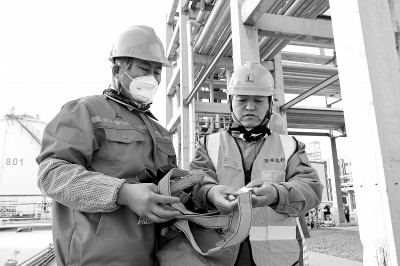 进入大检修期以来,塔河炼化严格执行直接作业环节安全确认检查卡制度,内容涉及七大作业(动火、高处、受限、起重、动土、盲板、临时用电)的准备工作、作业过程及施工结束后的作业风险和管控措施。监护人员随身携带检查卡,按照流程逐项核查安全措施并对照落实。图为3月16日,该公司储运作业部监护人员(右)检查登高作业所需防护装备安全带。