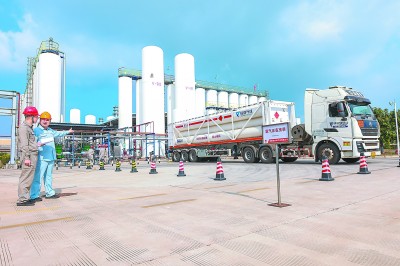 图1:3月23日,运输车在海南炼化厂区充装高纯度氢气,准备运往博鳌镇。吴淑汕 摄