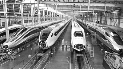 1月4日,动车组在车库内等候发运(无人机照片)。 春运在即,作为国内主要高铁动车生产企业,中车青岛四方机车车辆股份有限公司对即将服务春运的动车进行检修,确保动车以优良的状态投入到春运一线运营中。 新华社记者 李紫恒 摄