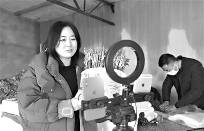 1月9日,在新民市大民屯镇毓宝台村大棚里,农民在大棚里直播销售刺嫩芽盆栽。 近日,辽宁省新民市大民屯镇毓宝台村的反季刺嫩芽陆续上市销售,每斤零售价超过50元。据了解,目前毓宝台村林下种植刺嫩芽面积500亩,亩产杆平均2000棵。刺嫩芽本来在春天上市,经过大棚培育反季销售,春节期间卖上了好价钱,农民得到了实惠。 新华社记者 杨青 摄
