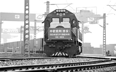 2月1日,X8151次中欧班列从西安国际港站驶出开往明斯克。 当日,满载日用百货的X8151次中欧班列从西安国际港站驶出,开往白俄罗斯首都明斯克。2023年1月,陕西中欧班列开行突破300列,达到346列,创历史同期最好成绩,取得新年开门红。新华社记者 李一博 摄