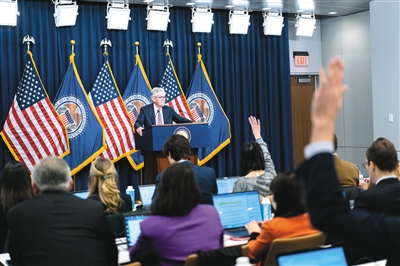 2月1日,美国联邦储备委员会主席鲍威尔(后)在华盛顿出席新闻发布会。美国联邦储备委员会1日结束为期两天的货币政策会议,宣布将联邦基金利率目标区间上调25个基点到4.5%至4.75%之间。 新华社记者 刘杰 摄