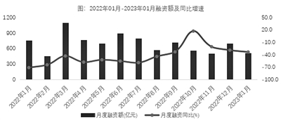 具体来看,2023年1月,房地产企业非银融资总额为508.5亿元,同比下降33.1%,环比下降27.0%。行业平均利率为4.32%,同比上升0.41个百分点,环比上升0.23个百分点。从融资结构来看,房地产行业信用债融资297.2亿元,同比基本持平,环比下降27.6%;海外债发行67.3亿元,同比下降21.2%;信托融资15.6亿元,同比下降82.2%,环比下降81.9%;ABS融资128.4亿元,同比下降55.5%,环比下降36.0%。