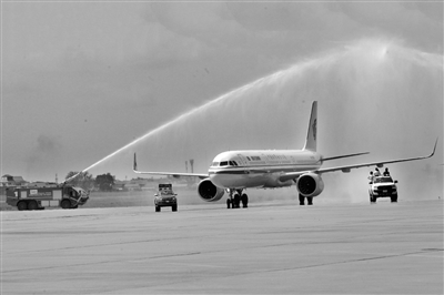 2月7日,国航航班在柬埔寨首都金边国际机场接受水门礼。 2月7日,一架载有中国乘客的国航航班从北京出发抵达柬埔寨首都金边国际机场,受到柬埔寨热烈欢迎。新华社发(批隆 摄)