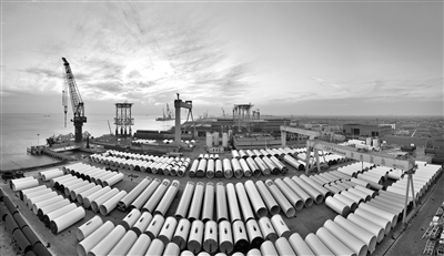 等待交付的海上风电场风机塔筒(2月7日摄,无人机照片)。