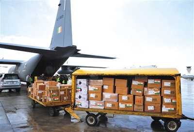 2月8日,在叙利亚大马士革的机场,工作人员卸载印度提供的救援物资。土耳其南部靠近叙利亚边境地区6日发生强烈地震后,遭受重大人员伤亡的土叙两国震后救援工作面临重重困难。国际社会不断向灾区伸出援手,多国派出救援队、提供救援物资紧急驰援。 新华社发(阿马尔·萨法尔贾拉尼 摄)