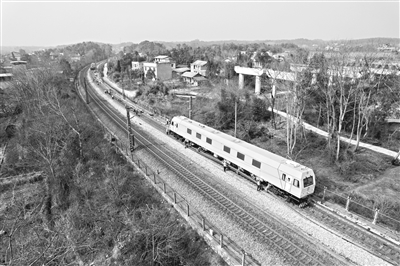 2月19日,在沪昆铁路娄底至湘潭东区间,一辆快速换轨车正在施工(无人机照片)。 近日,在沪昆铁路娄底至湘潭东区间,广铁集团广州工务大修段工人在不影响线路运行的情况下,抓紧时间对线路进行换轨施工。本次施工预计3月底完工。新华社记者 陈思汗 摄