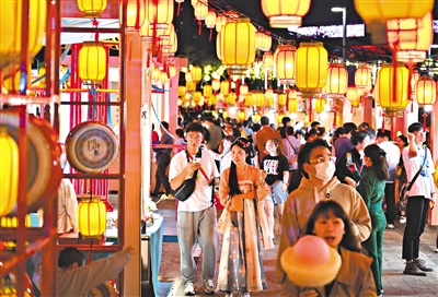 游客在海口日月广场逛古风市集(2月19日摄)。 今年以来,海南省海口市着力打造“市集经济”。各类特色市集加速消费市场复苏的同时,也为灵活就业群体的创业就业提供了平台。新华社记者 郭程 摄