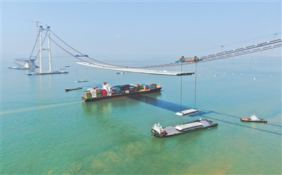 2月22日,集装箱货轮通过正在吊装钢箱梁的深中通道伶仃洋大桥(无人机照片)。
