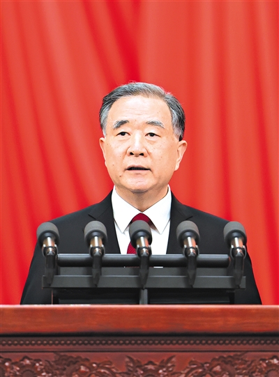 下午3时,王沪宁宣布大会开幕,全体起立,高唱中华人民共和国国歌。